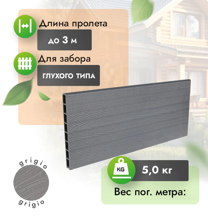 Наши заборные доски из ДПК выдерживают до 3318 кг/м2, влагостойкие, не требуют ухода.